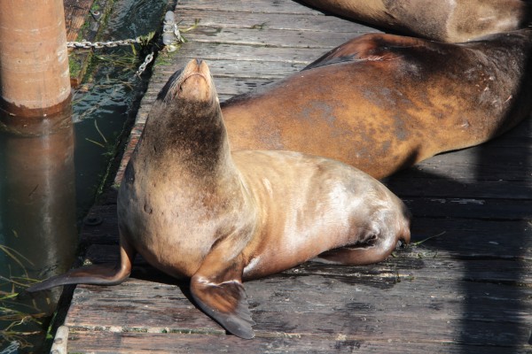Der Morgen in Newport begrüßt uns so, wie uns der Abend in den Schlaf gebracht hat: Mit tosendem Gegrolle aus Richtung Pazifik. Die Schaumkronen haben abgenommen und der Wind ist geringer als gestern - also versuchen wir unser Glück und fahren ins Bayfront-Viertel. Dort hören wir schon am Parkplatz ein typisches Geräusch - klingt wie Seelöwen, sind Seelöwen. Ein kompletter Felsen und 2 alte Holzstege liegen voll mit Tieren. Nach ausführlicher Begutachtung und einigen Fotostops gehts zu Käptn Mo, dort lassen wir uns für eine Whalwatching-Tour eintragen - die Lady im Büro ist ganz guter Hoffnung und bittet uns gegen 13 Uhr nochmal vorbei zu schauen. Die letzten Tage fiel wegen zu hohen Wellen jedoch alles ins Wasser, heute könnte es besser sein.