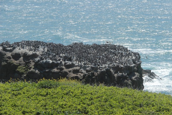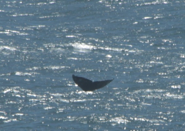 Da wir uns fest vorgenommen haben heute den Wal hüpfen zu sehen, fahren wir gen Norden bis zum alten Leuchtturm und schauen uns dort erstmal die Massen an Vögeln an, welche die Felsen vor der Küste besetzen. Und dann ruft irgendjemand "Over there he is!" und wir sehen nur noch die Finne abtauchen. Also Kamera gezückt - und wenige Minuten später geht das Spektakel weiter. 2 Grauwale tummeln sich ca. 1km vor der Küste. Im richtigen Moment entsteht das schönste Foto und ich erwische einen der Beiden beim Abtauchen.