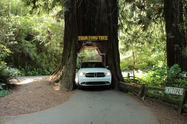 Weiter gehts nach Norden in den Praire Creek Redwood State Park, genauer nach Klamath. Dort gibts an der Ausfahrt Terwer Valley die Möglichkeit, sein Auto durch einen Baum zu zirkeln. Mit dem Dodge passen wir grade so durch - ohne die Außenspiegel einzuklappen. Kristin bekommt zwar Herzrasen - aber es klappt ohne anzuecken. Ein Spaß für 3$, den man mal mitmachen sollte.